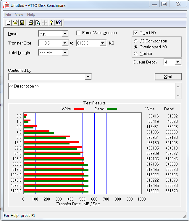 Both ATTO read and write results placed higher than listed specifications of 534MB/s read and 482MB/s write data transfer speeds. Very encouraging is the fact that, even at 4K file size, both read and write performance is already increasing rapidly.