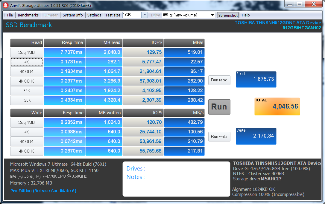 The Total Score of 4046 is an excellent result from Anvil Storage utilities and it is very rare that we see any SSD hit the 100MB/s mark in lo 4K random write testing.