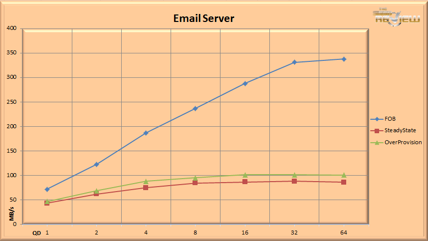 The Email profile is an emulation of a mail server, with a 50% Read and 50% Write mixed workload with very small 8KB files. This can be a very stressful test for even the best of drives. There is a drastic difference in the FOB compared to the Steady State performance, but this is to be expected with these extreme Read/Write mixed workloads.