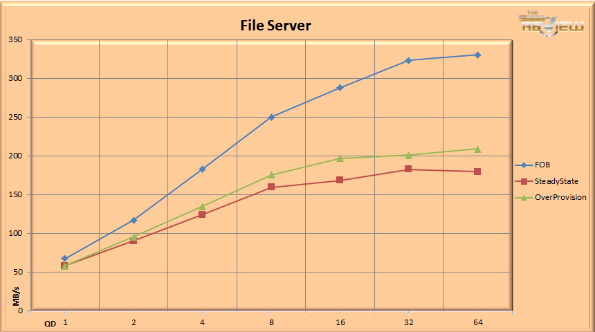 The File Server profile emulates usage in a file server environment with a vast range of file sizes being accessed simultaneously. The access is 80% Read and 20% Write, which actually lends itself very well to the strengths of the Toshiba drive right out of the box. With 90K Read IOPS and 16K write IOPS under Steady State conditions, the SSDs specifications line up very well with this type of usage. There is also a negligible performance gain from the OP, as the drive is already well-suited for this task.