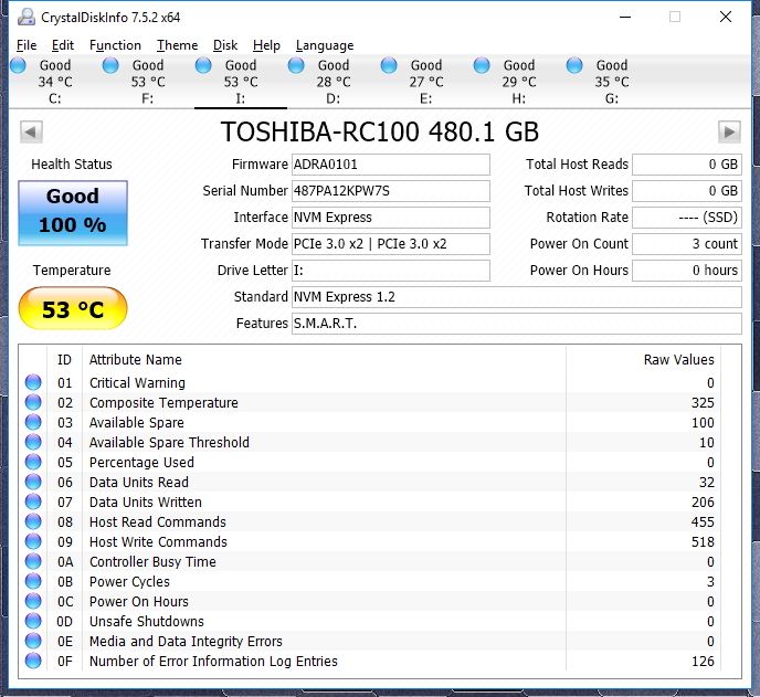 With a quick glance over Crystal Disk Info’s report, we can see a lot of useful SMART data. The RC100 features host read and write attributes, shows the power on count and hours, displays the temperature of the controller, as well as other important lifetime monitoring data. Furthermore, CDI shows us that the RC100 reports as an NVMe 1.2 devices, that we are connected via a PCIe 3.0 x2 link, and the firmware we are testing on today is version ADRA0101.