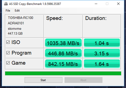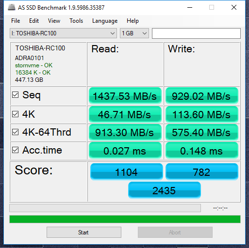 In AS SSD, the Toshiba RC100 averaged a score of 1975 points at the 240GB capacity and 2435 points at the 480GB capacity. As per usual, AS SSD shows slightly lower performance than ATTO and CDM. The RC100 delivers around 1.4GB/s read and 900MB/s write here. 4K performance is similar to CDM’s results and the copy benchmark results are very fast. ISO copy speeds reach over 1GB/s and Game copy speeds surpass SATA speeds with ease.