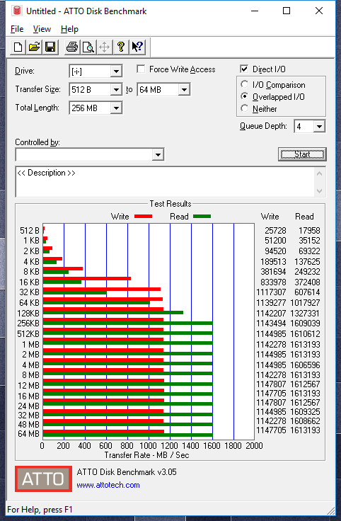 ATTO Disk Benchmark is perhaps one of the oldest benchmarks going and is definitely the main staple for manufacturer performance specifications. ATTO uses RAW or compressible data and, for our benchmarks, we use a set length of 256mb and test both the read and write performance of various transfer sizes ranging from 0.5 to 8192kb. Manufacturers prefer this method of testing as it deals with raw (compressible) data rather than random (includes incompressible data) which, although more realistic, results in lower performance results.