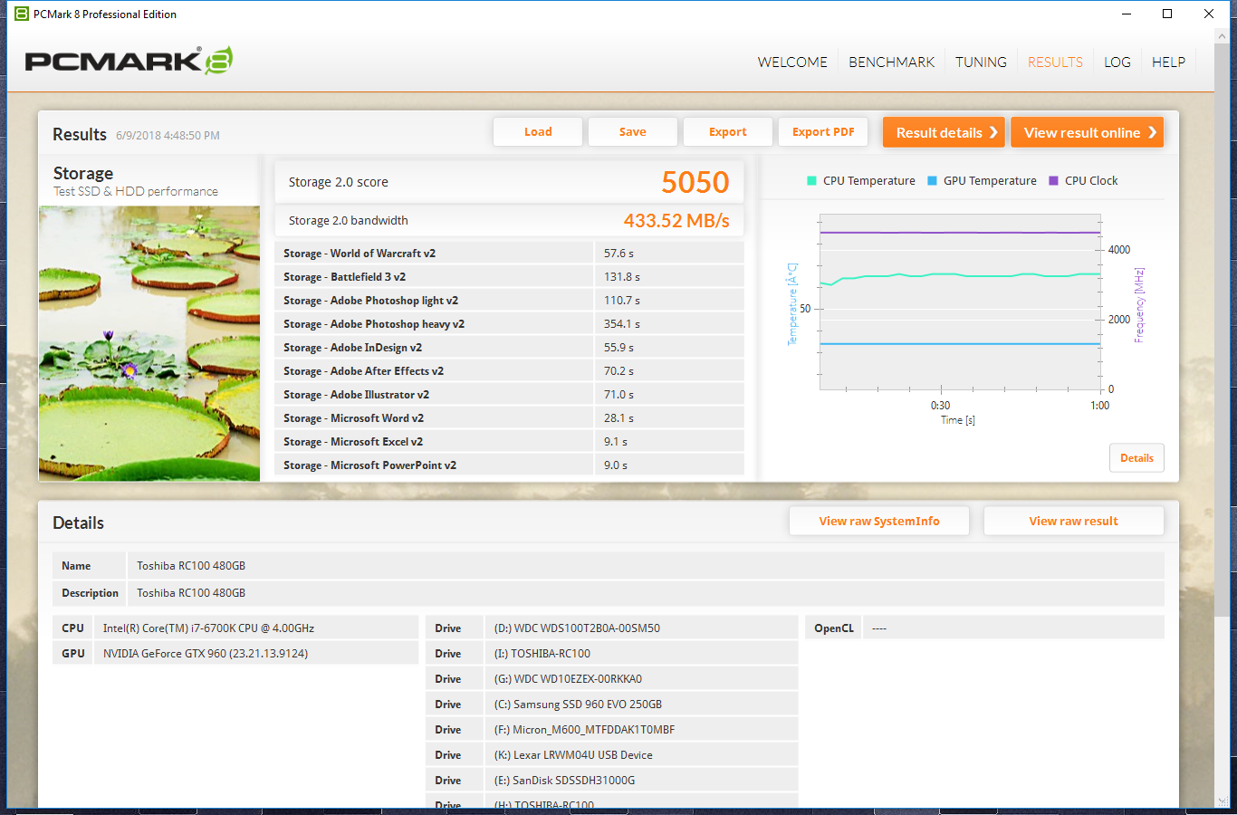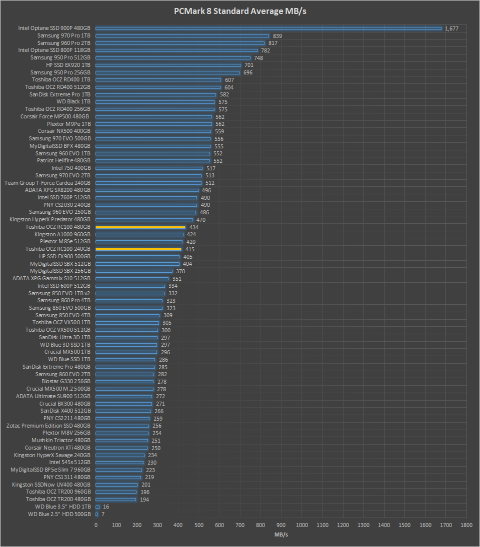 In PCMark 8 the 240GB Toshiba RC100 scored 5047 points and averaged 414.94MB/s in bandwidth. The 480GB model scored 5050 points and has a slightly higher average bandwidth result of 433.52MB/s.