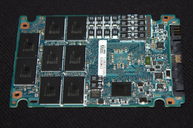 On the flip side, we see 8 more NAND packages, power loss capacitors and another DRAM package. Each DRAM package consists of 4Gb (512MB) of DDR3 DRAM from SK Hynix, totaling 1GB.