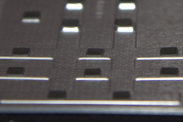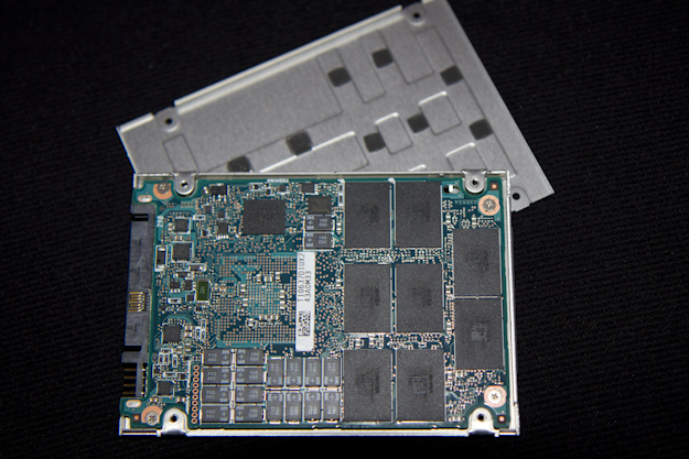 The thin stamped aluminum case is also a departure from the aluminum block that encases the HGST drive. The case has channels stamped into it that are presumably used for heat dissipation. Instead of large thermal pads covering multiple components, the PX02SS has smaller pads that are dedicated to all of the NAND, DRAM and controller packages.