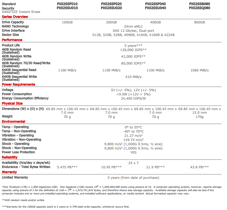 The PX02SS comes in 4 different capacities (100, 200 400 and 800GB) and is priced at $1070, $1815, $3080 and $5925, respectively. At over $7/GB, the PX02SS definitely commands a premium, but considering its cutting edge 12Gbps interface and high endurance eMLC NAND, it is competitively priced. Each capacity is available in a standard configuration or with additional security features such as SANITIZE Instant Erase. Each model draws a healthy 9W of power meaning that you will need provide adequate airflow to keep the drive cool. The 5 year warranty is fairly standard for SSDs of this class, but is worth mentioning.