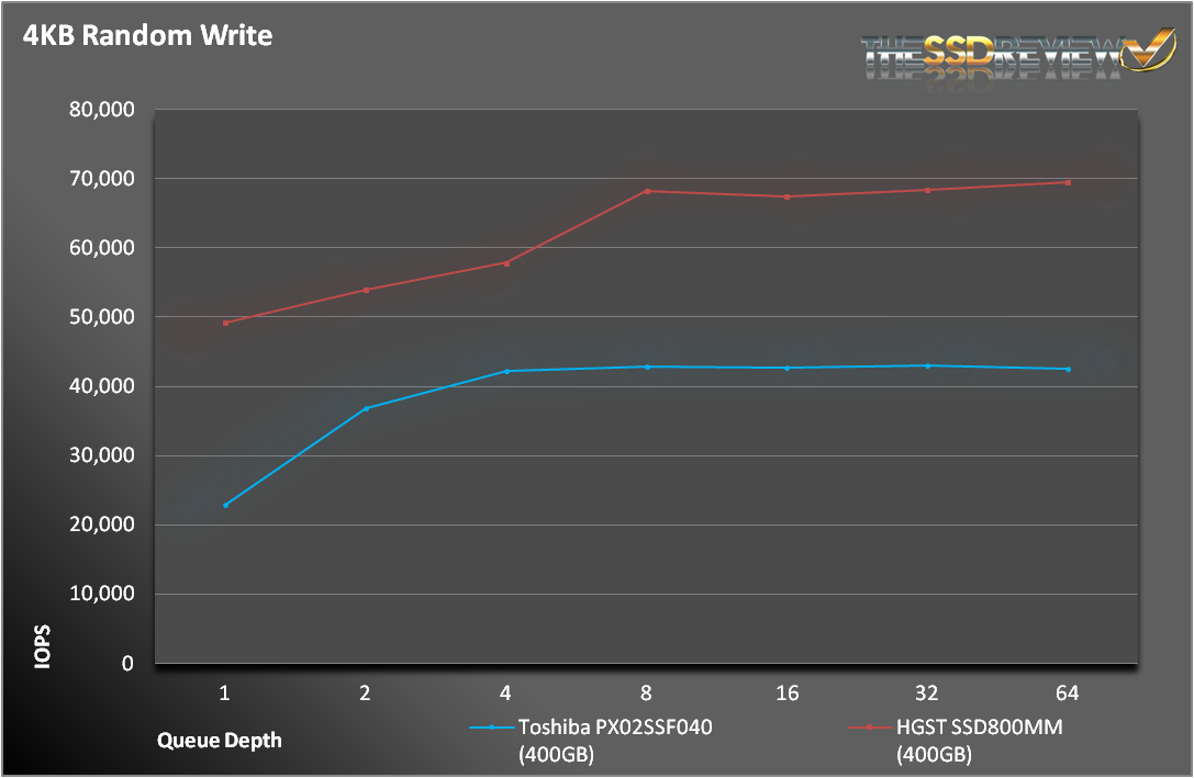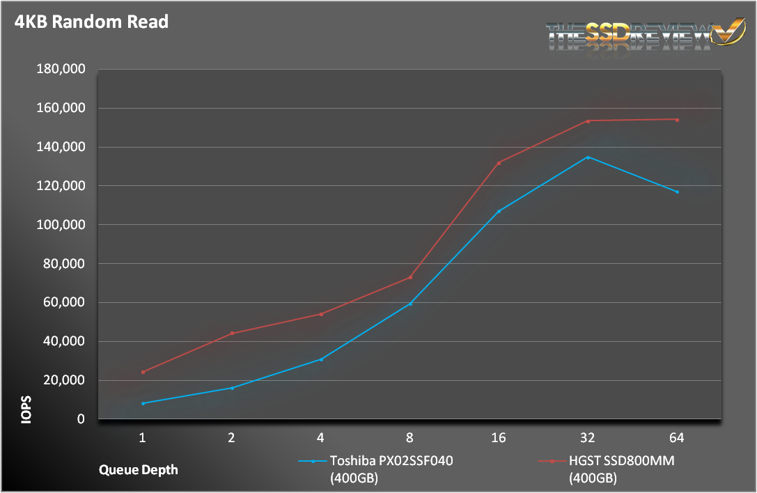 For random 4K writes, the HGST holds a clear and commanding lead over the Toshiba. The difference alone (27K IOPS) would make a formidable SSD. The difference in random 4K reads is much closer, but still a consistent 15-25K IOPS.
