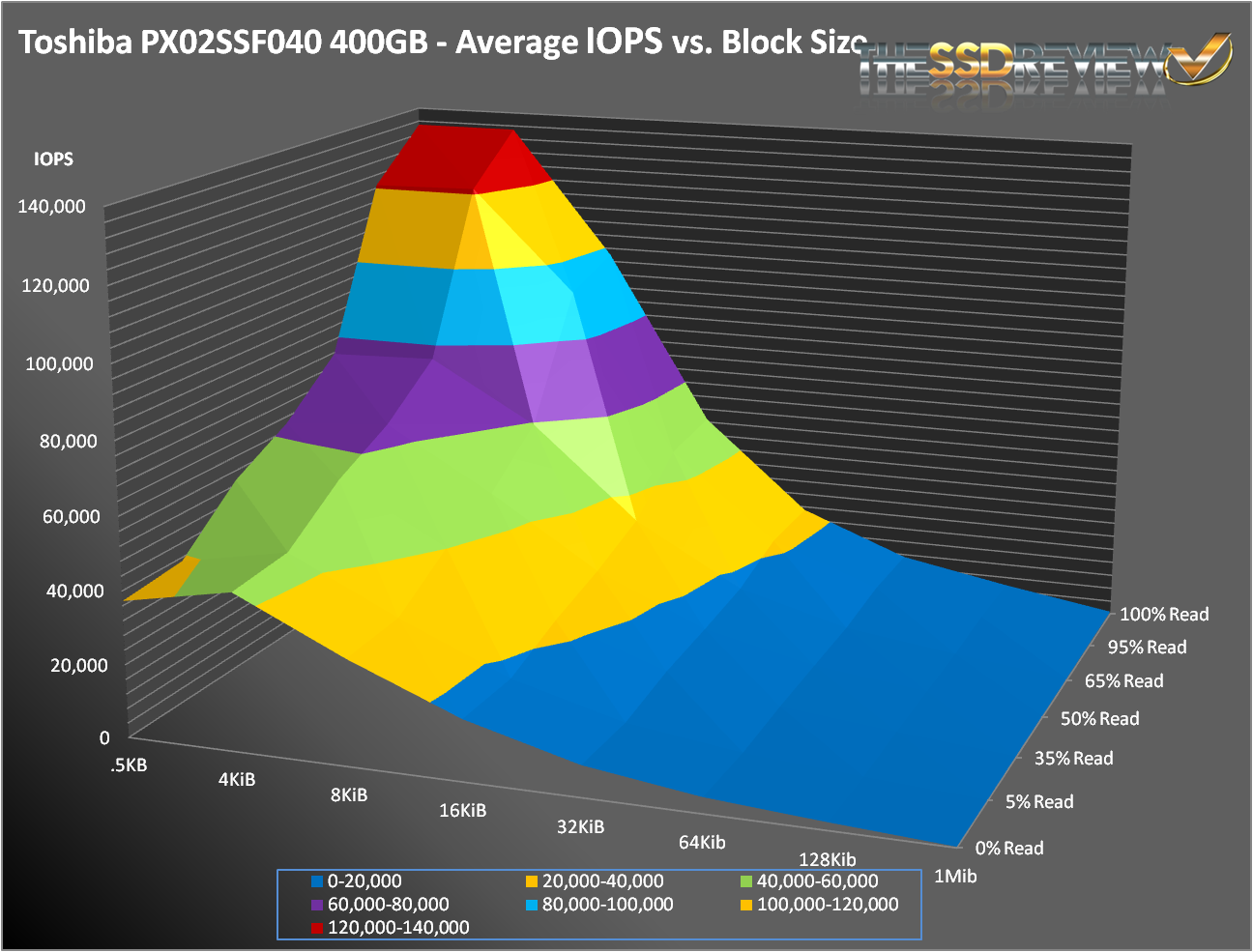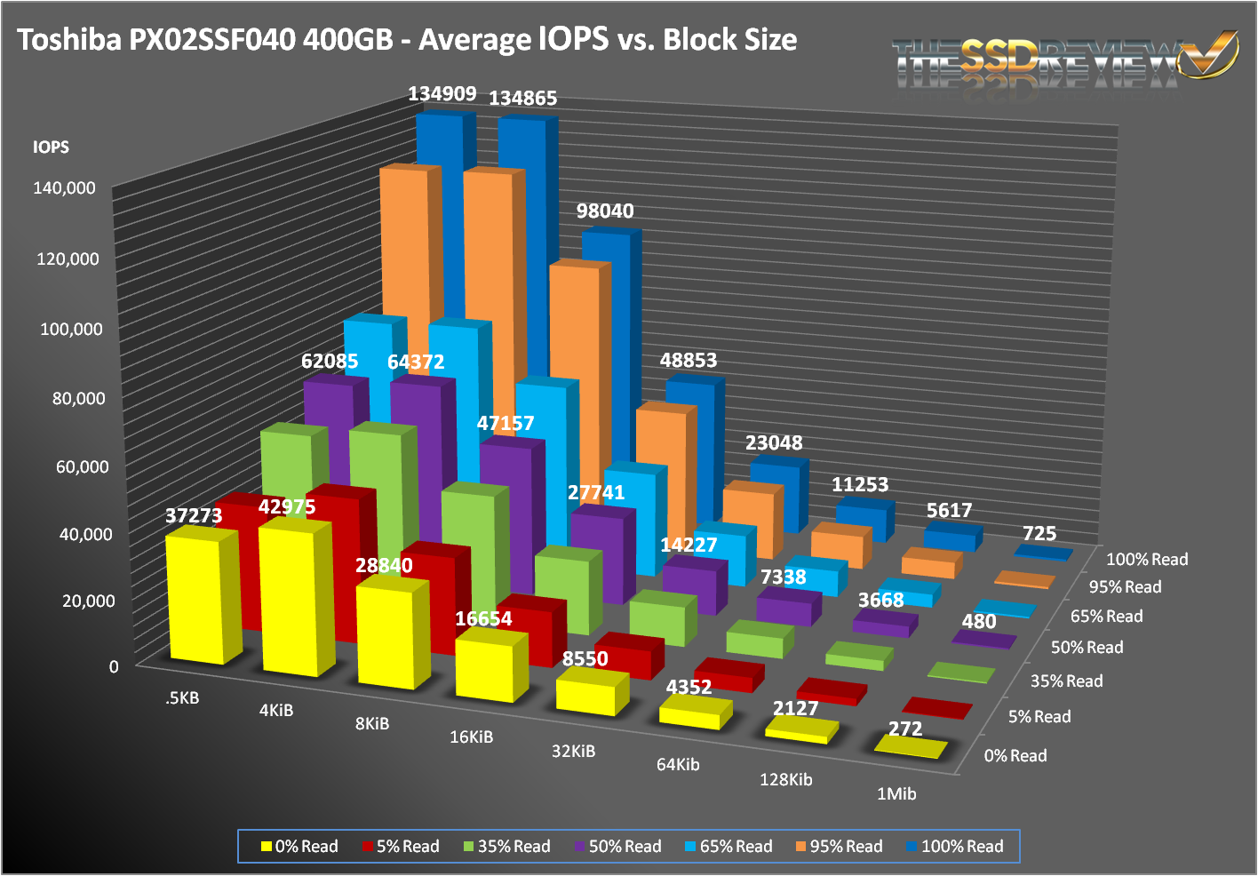Even though the PX02SS met its specifications at the corners, it just couldn’t match the SSD800MM. But, a funny thing happened when we looked into the SNIA results. In the meaty middle of the chart, the PX02SS actually pulled out a clear win. With workloads between 5 and 95% reads and transfer sizes between 8KB and 1MB, the PX02SS had higher performance in 28 of 30 tests. That is impressive.