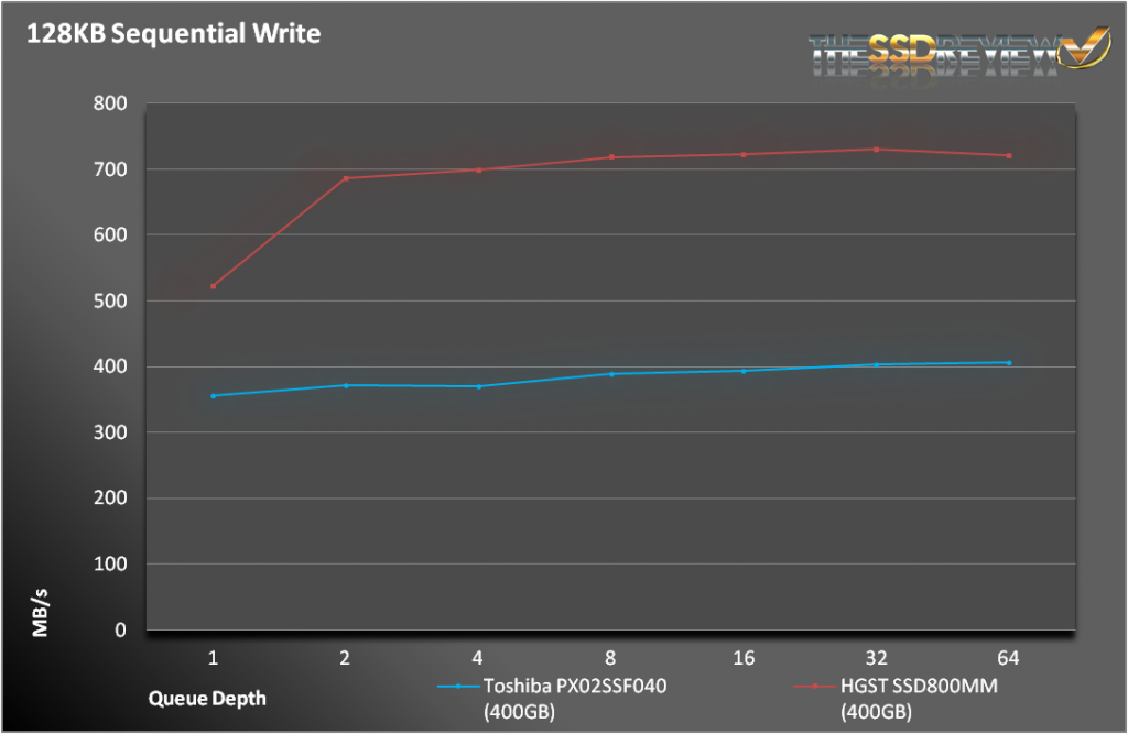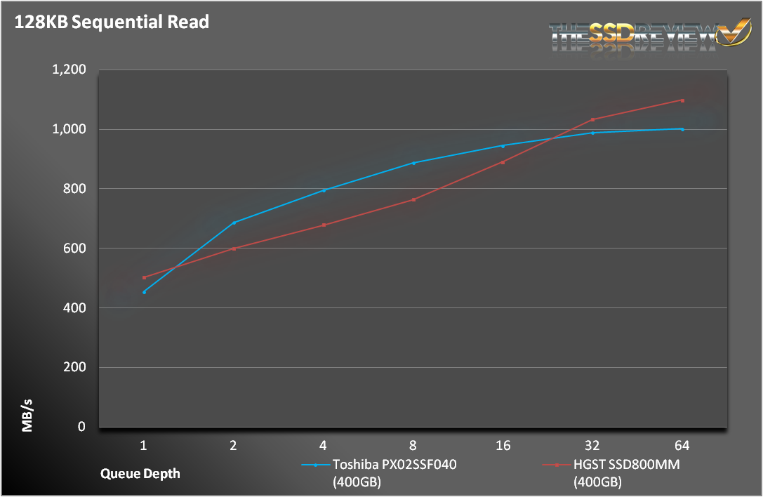 We knew what we were getting into when we started the sequential tests. The write results were very underwhelming, more on par with the Intel S3700 that is 1/3 of the price. Read performance is more what we expected. At nearly double of what you find on 6Gbps SATA/SAS SSDs, read operations take full advantage of the extra interface bandwidth. At certain queue depths, the PX02SS actually took the lead before finally giving way to the HGST.