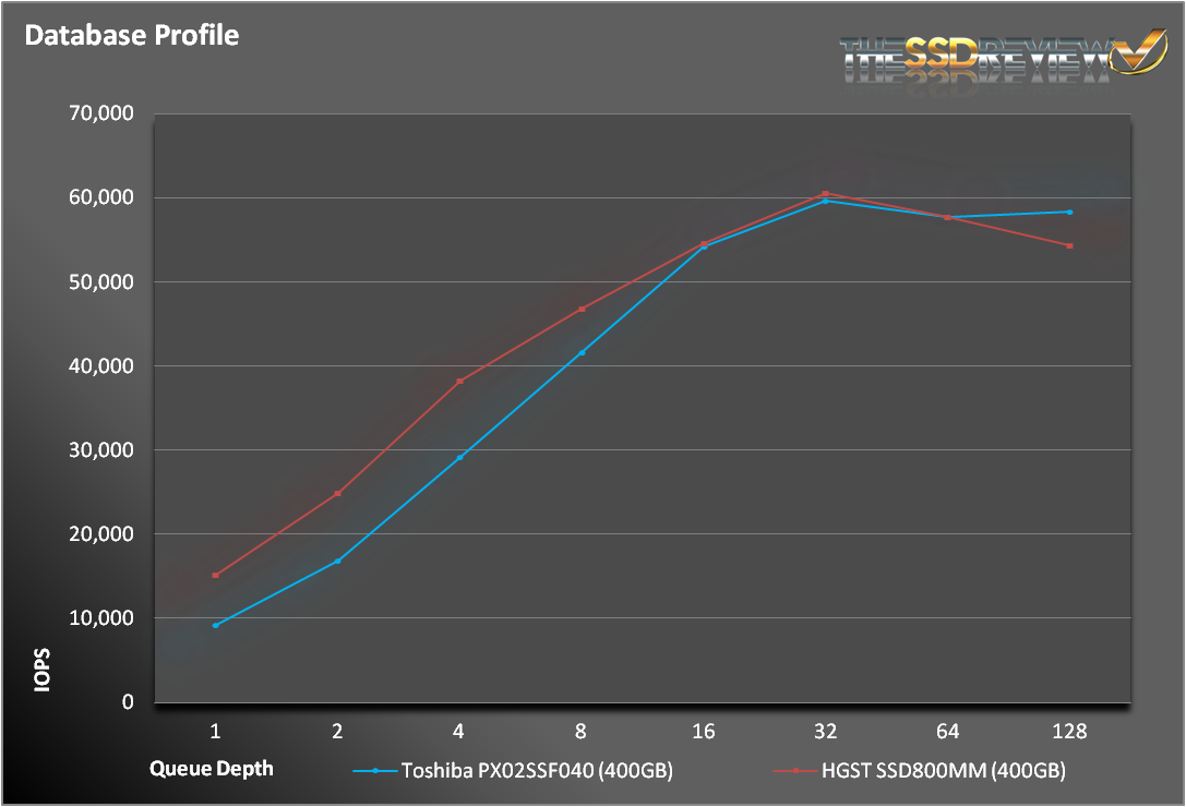 Based on the results of the SNIA tests, this workload was tailored made for the Toshiba PX02SS. The perfect read/write mix with just the right transfer sizes. To say the Toshiba won is an understatement. The PX02SS held a nearly 50% advantage at half the queue depths.