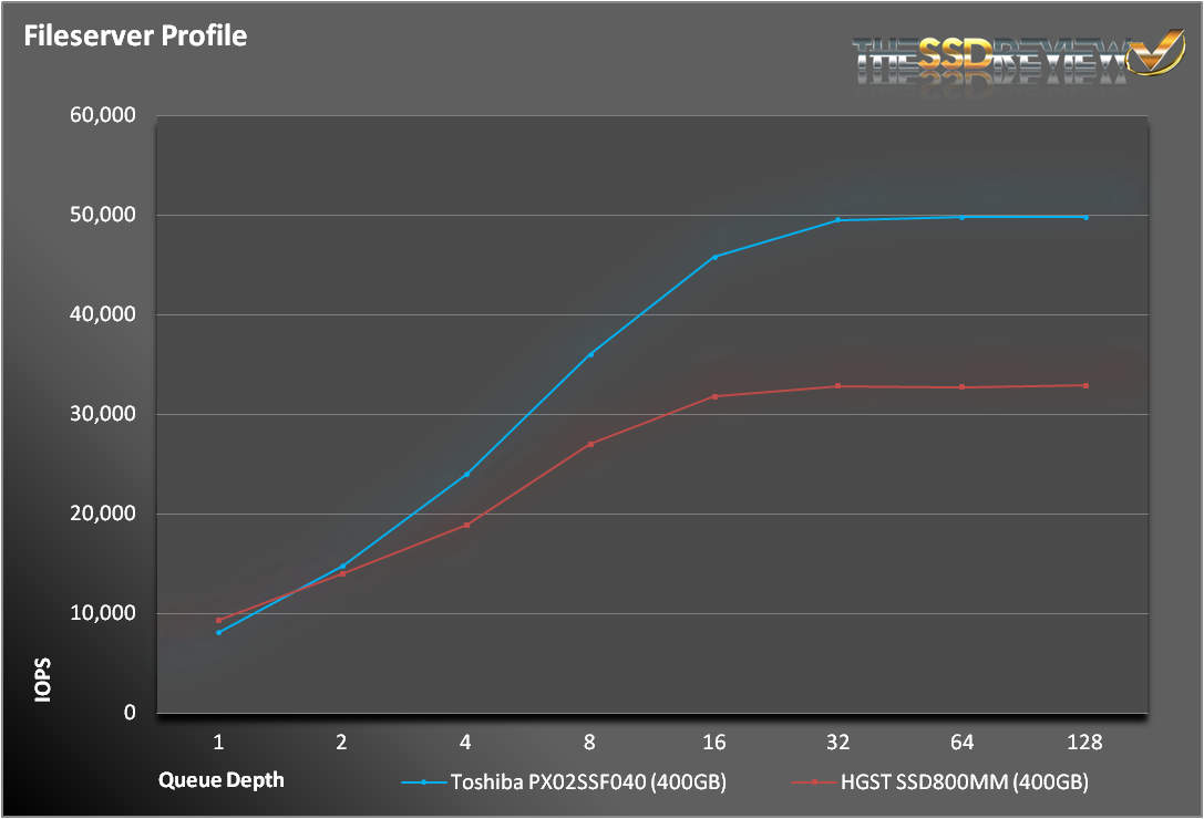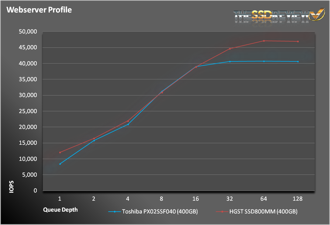 The PX02SS had more trouble with the fileserver profile. While both drives stayed even at lower queue depths, the HGST pulled away at higher queue depths. Even though the fileserver and webserver profiles are similar, the lack of writes allow the superior read performance of the SSD800MM to take over.