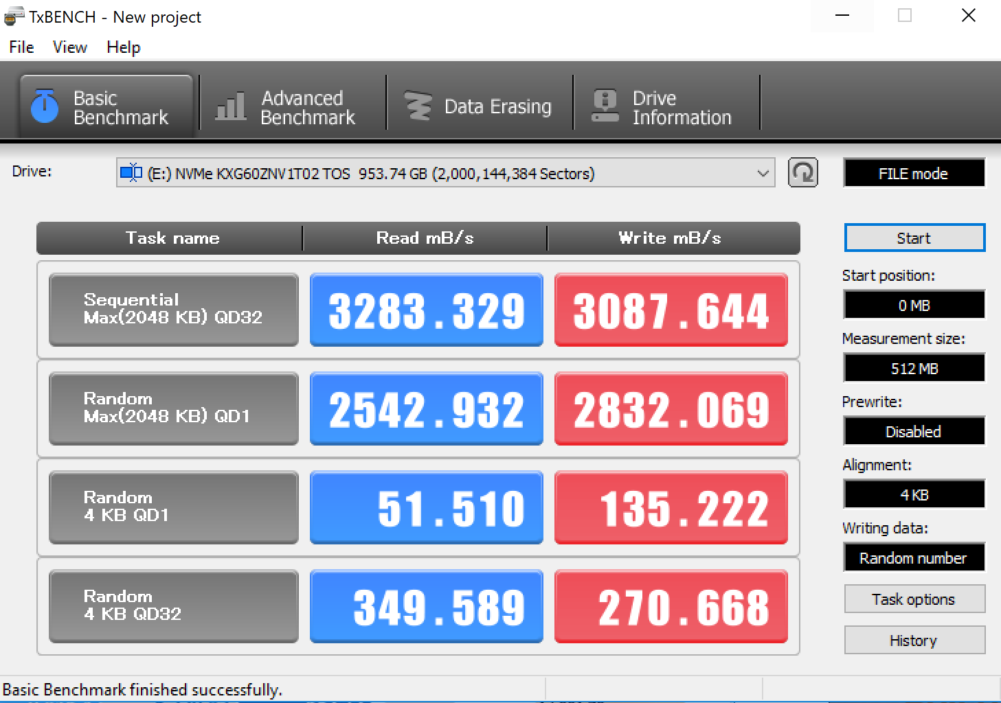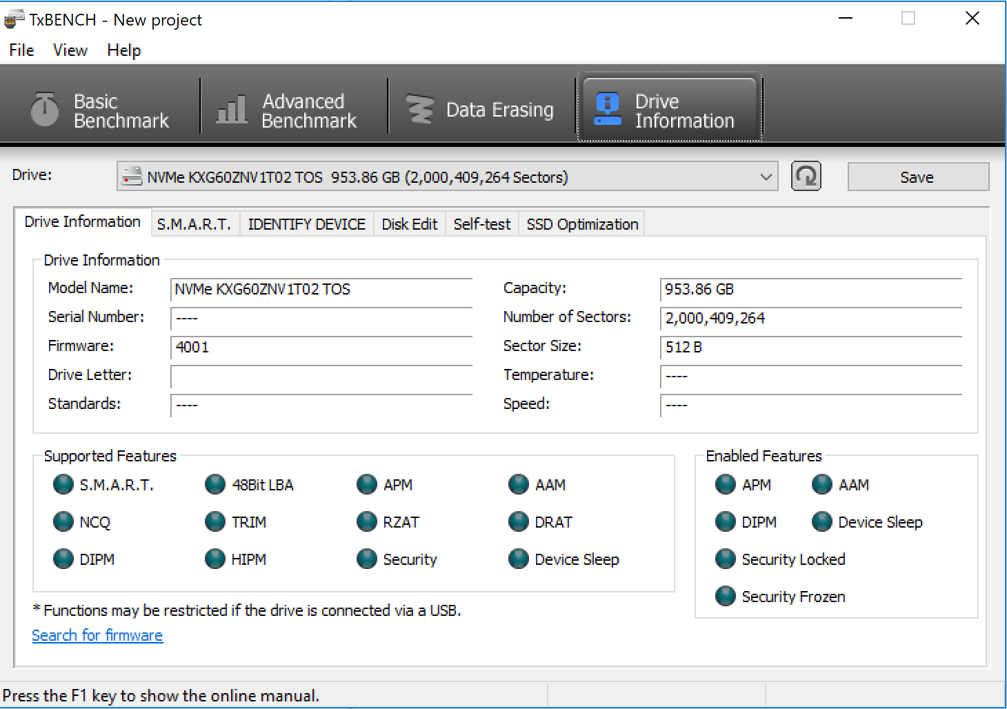 Once again, results are consistent with other tests and very high. This software allows quite a bit of user test configurations as we can see with the last set. As well, this result below displays the Toshiba XG6 drive details:
