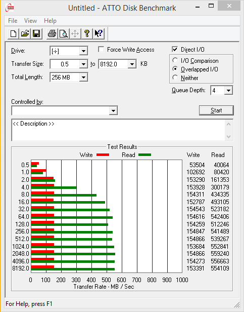 So far, things are looking good. ATTO shows the 128GB MTS800 is able to reach 559MB/s read and 155MB/s write speeds.