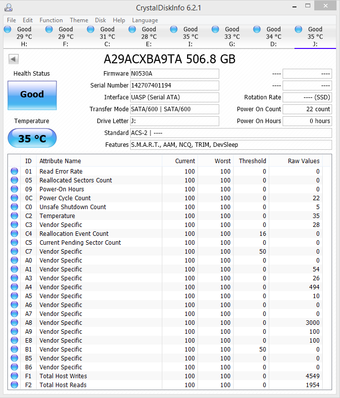 Crystal Disk Info is a great tool for displaying the characteristics and health of storage devices. It displays everything from temperatures, to the number of hours the device has been powered, and even to the extent of informing you of the firmware of the device.