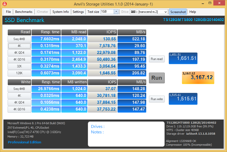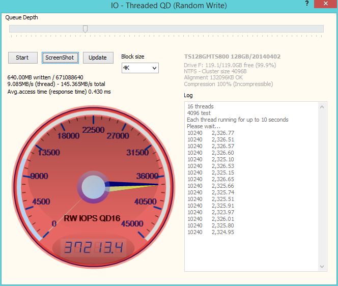 Anvil’s Storage Utilities (ASU) are the most complete test bed available for the solid state drive today. The benchmark displays test results for, not only throughput but also, IOPS and Disk Access Times. Not only does it have a preset SSD benchmark, but also, it has included such things as endurance testing and threaded I/O read, write and mixed tests, all of which are very simple to understand and use in our benchmark testing.