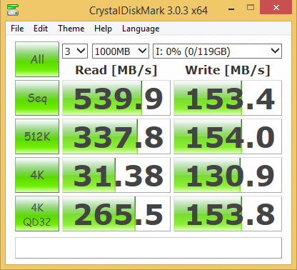 Crystal Disk Mark shows us a high of 539.9MB/s for sequential read and 153.4MB/s sequential write. Both 4K reads and writes are decent coming in at 31.38MB/s for 4K read and over 130.9MB/s for 4K writes.