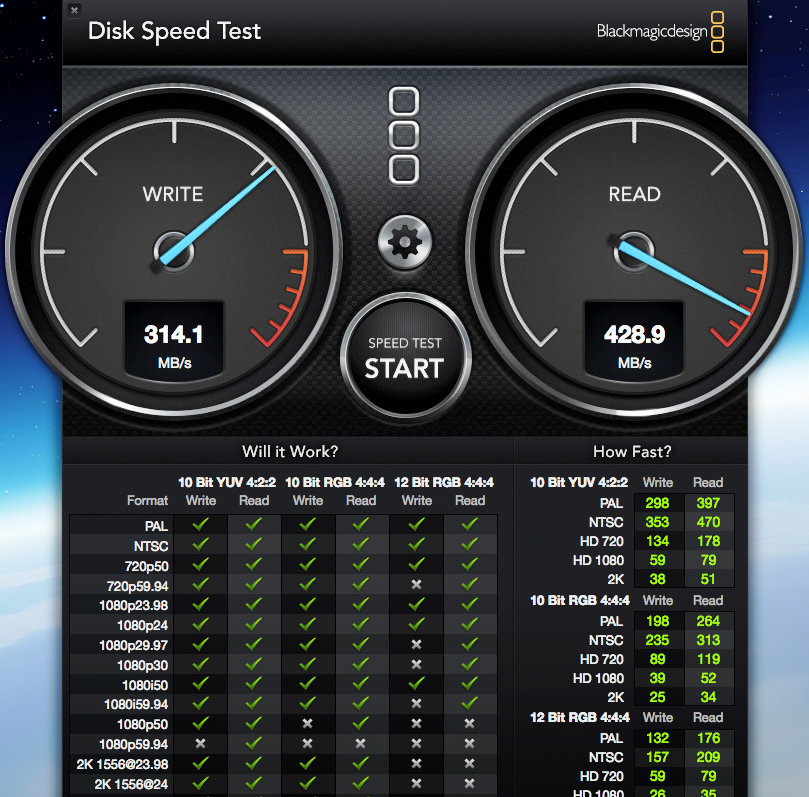 Disk Speed test is the most familiar benchmark to most OSX users and has been around for some time, extending results from synthetic to video as well: