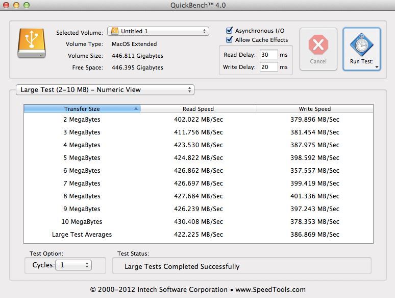 Transfer speeds of above 400MB/s for both read and write testing are excellent.