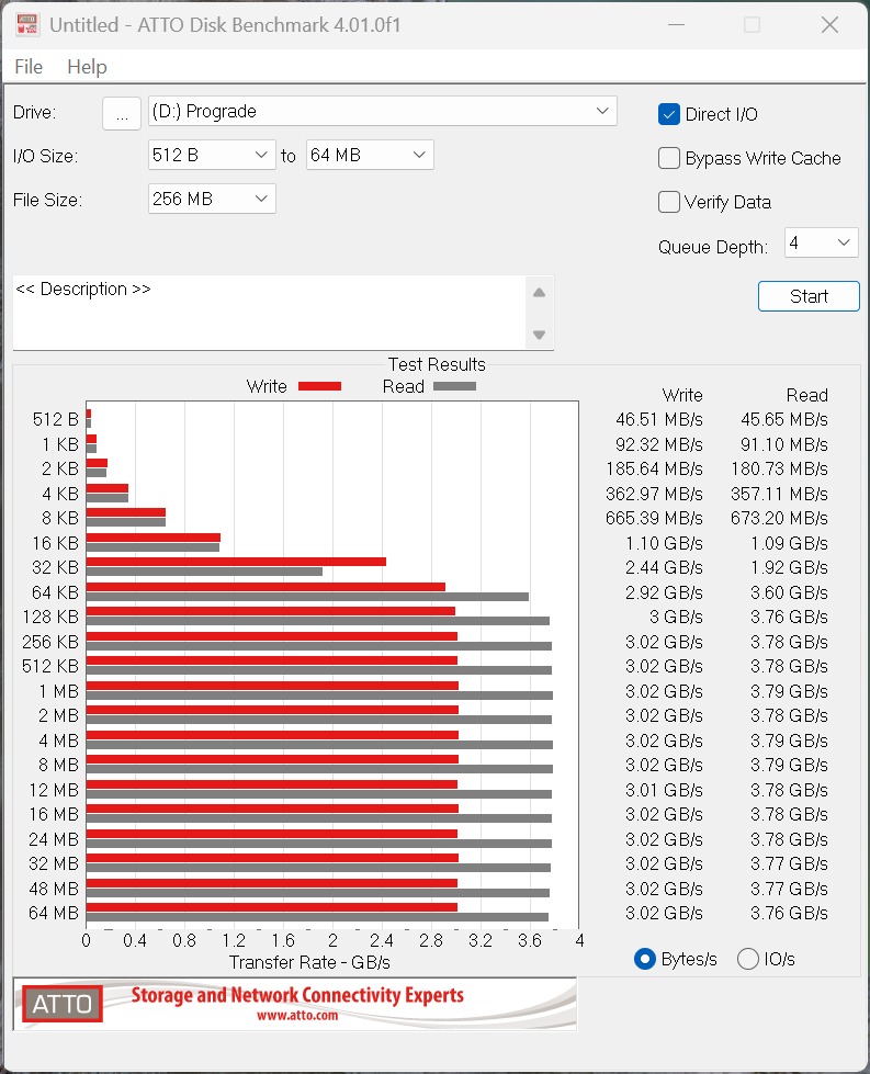 The ProGrade PG10.5 USB4 Mini 2TB Portable SSD did a just bit lower than we expected with highs of 3.79GB/s read and 3.02GB/s write, but that read result makes us confident that the drive is running at full 40Gbps speeds.