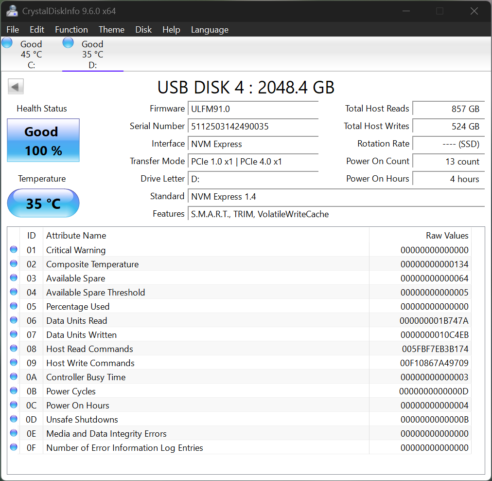 Crystal Disk Info is a great tool for displaying the characteristics and health of storage devices. It displays everything from temperatures, the number of hours the device has been powered, and even to the extent of informing you of the firmware of the device.