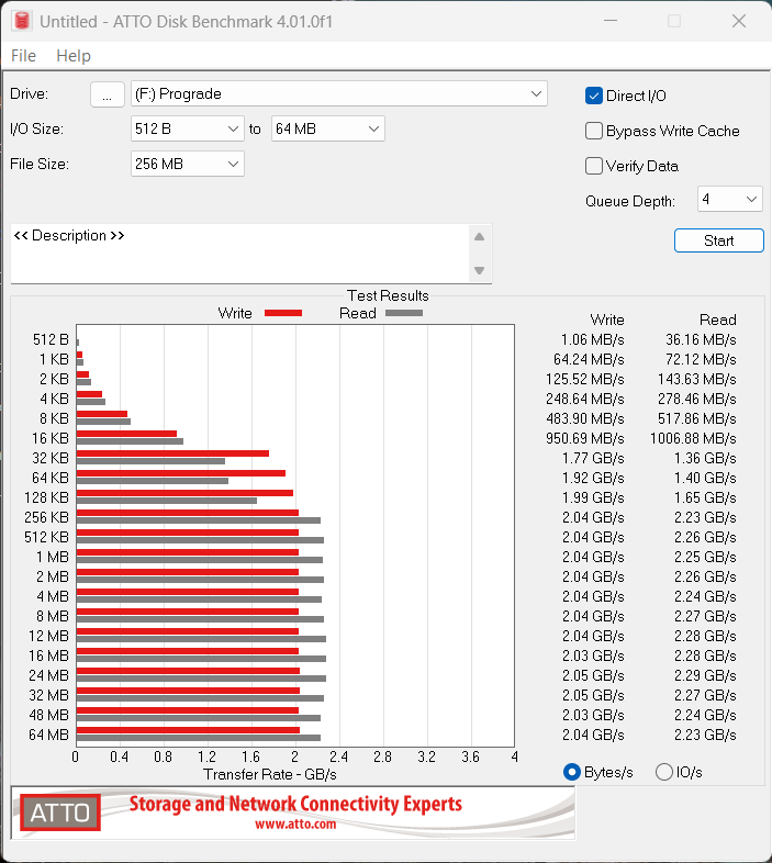 ATTO Disk Benchmark is perhaps one of the oldest benchmarks going and is definitely the main staple for manufacturer performance specifications. ATTO uses RAW or compressible data and, for our benchmarks, we use a set length of 256mb and test both the read and write performance of various transfer sizes ranging from 0.5 to 8192kb. Manufacturers prefer this method of testing as it deals with raw (compressible) data rather than random (includes incompressible data) which, although more realistic, results in lower performance results.