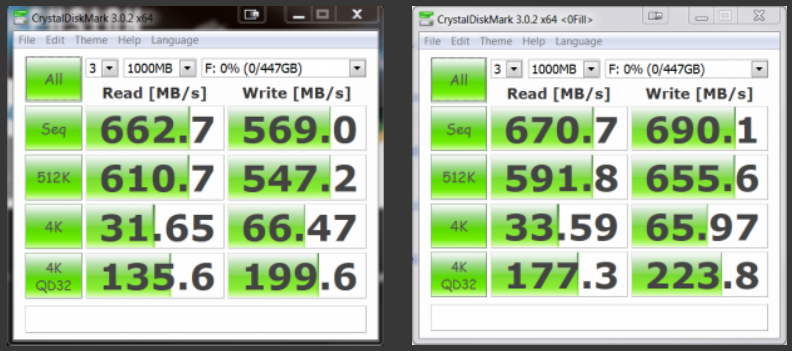 Crystal Disk Benchmark is used to measure read and write performance through sampling of highly compressible data (oFill/1Fill), or random data which is, for the most part, incompressible. AS we are using a LSI SandForce solution, we have provided test results using random, or highly incompressible data, on the left and that of very compressible data on the right.
