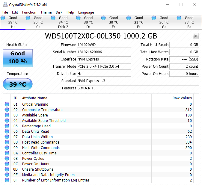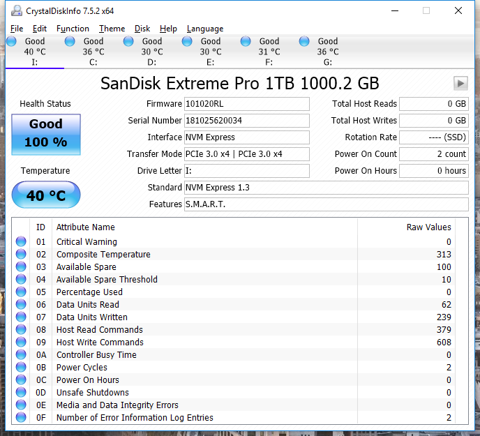 Crystal Disk Info is a great tool for displaying the characteristics and health of storage devices. It displays everything from temperatures, the number of hours the device has been powered, and even to the extent of informing you of the firmware of the device.