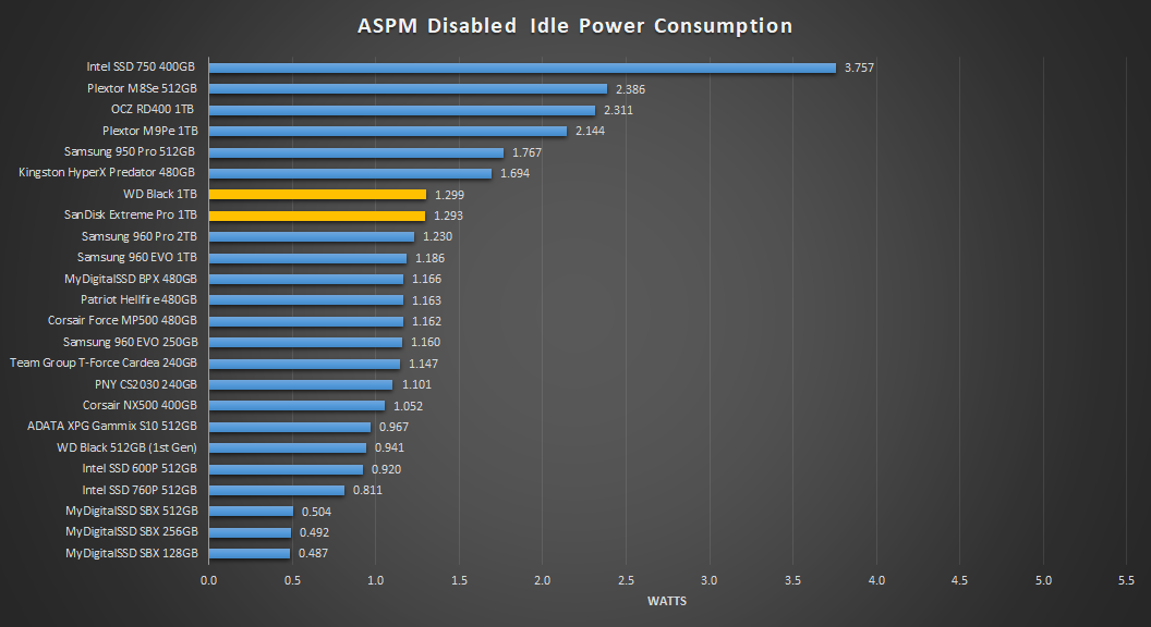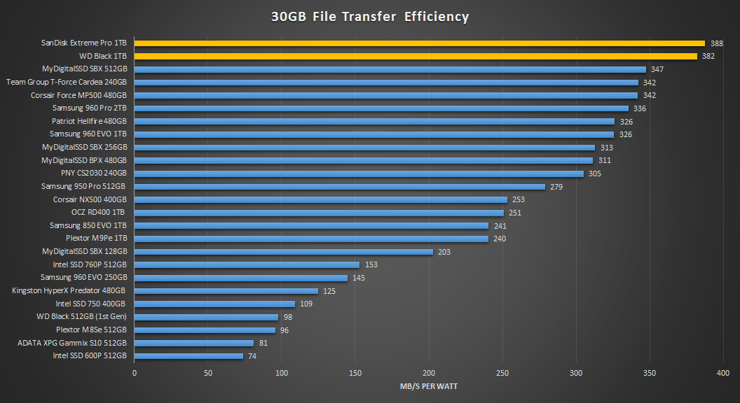 The chart above shows us just how efficient an SSD is in writing data. Here we can see that the new WD Black and SanDisk Extreme Pro average about 385MB/s per watt. This is a very big improvement over the original WD Black and brings these drives to the top of the chart!