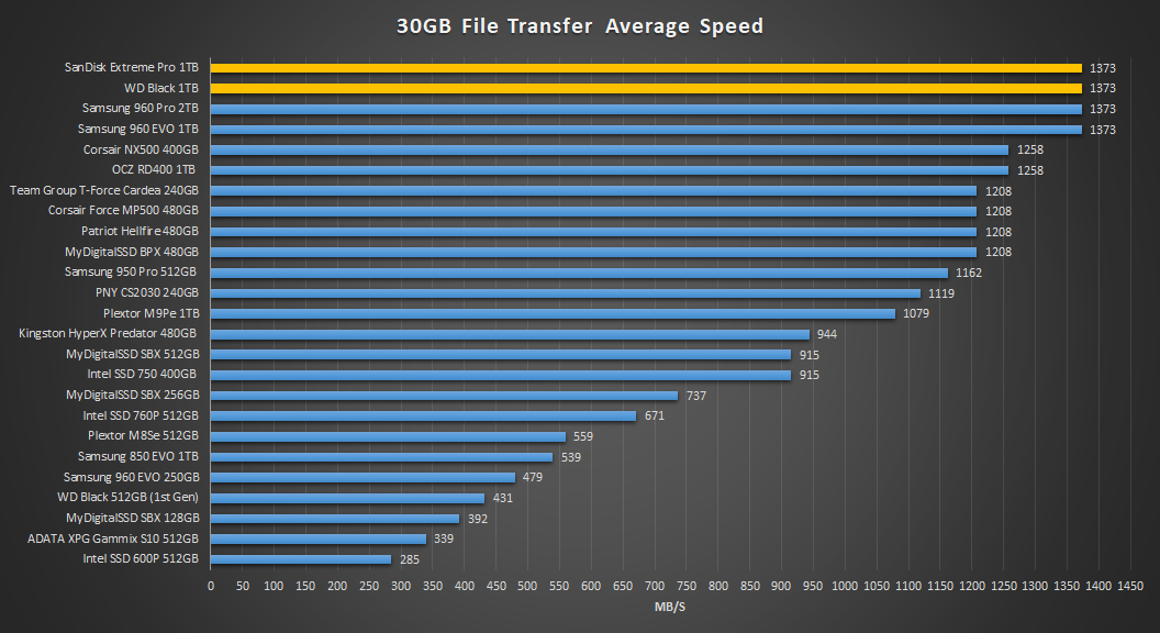 The new WD Black and SanDisk Extreme Pro averaged 1,373MB/s during the 30GB write transfer. From this result, we do not see the SLC cache exhausting, so this is very good so far.