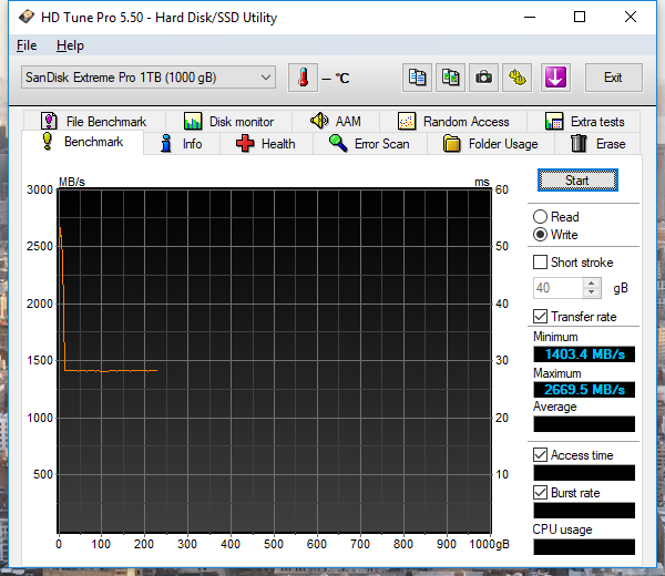 HD Tune is a Hard Disk Utility with many functions from error checking, health testing (S.M.A.R.T.), and of course benchmarking. To build upon our real world write test we also looked to see where the write speeds leveled off to by using HD Tune Pro. If SLC caching is being utilized, this test will typically show it.