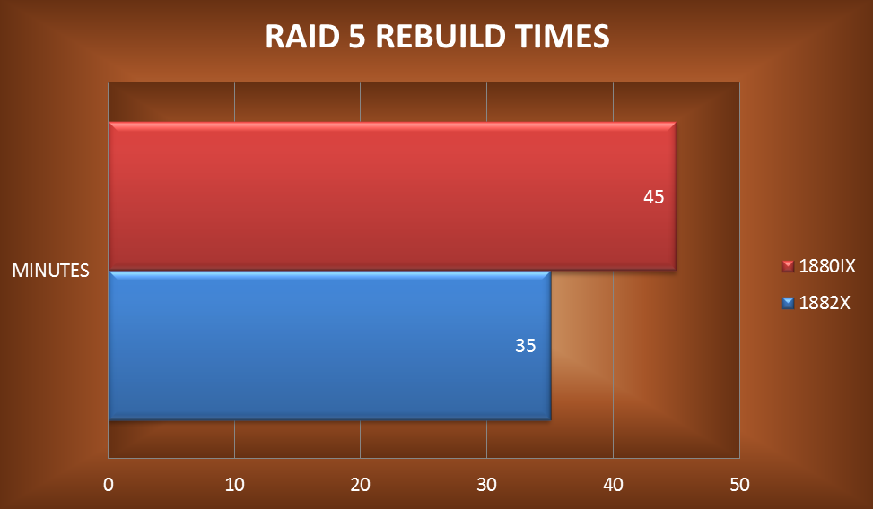 As illustrated here, the 1882 shows a roughly 23 percent improvement in rebuild speed. This is with only 20 GB of data on the array, as we are just trying to illuminate a percentage of improvement. For extremely large volumes, when rebuilds can stretch into time-frames that are measured in days, not minutes, an improvement off this magnitude is very advantageous for the end user.
