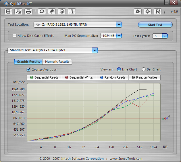 Below are some benchmarks that we conducted with a degraded RAID 5 array. The 1882 performs very well in this category. Clicking the results below will allow you to scroll through the results.