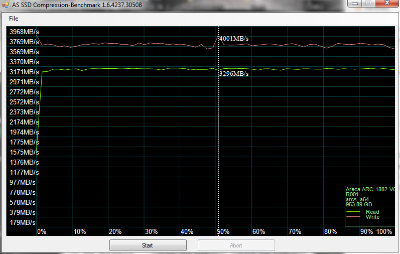 The compression testing is going to give us the highest score with 2 cards that we observed; right at the 4GB/s read speed!