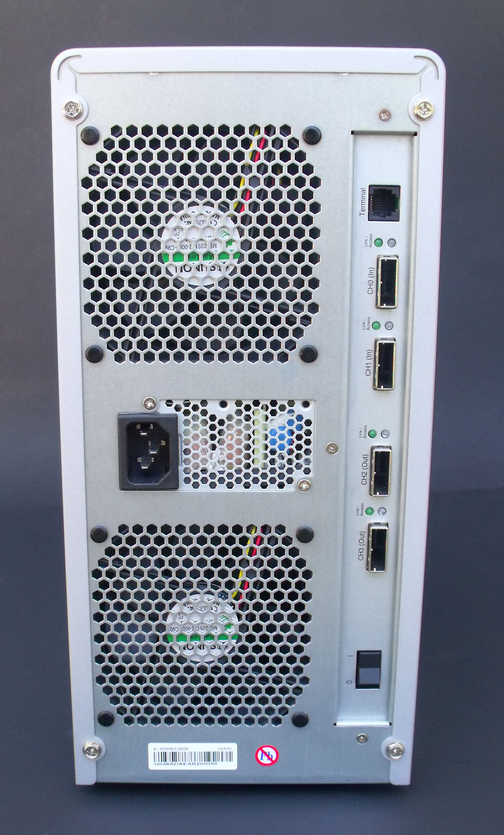 The rear of the unit is going to show us quite a bit about how this device functions. The two large mesh areas at the top and bottom are fans that actively draw air into the enclosure from the front of the unit, sucking it past the drives and out the rear of the device. One thing that really strikes me is the amount of time and consideration put into this design to afford the maximum amount of airflow possible to the drives. The fans are just the beginning of the airflow, and as we go through the different components, we will point out the entire myriad of steps taken in the design to create absolutely great airflow.