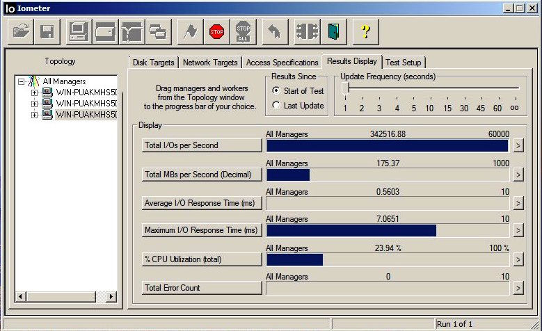 One must also bear in mind that this is the limit of the RAID controller, and NOT the enclosure. It is possible that many more IOPS could be passed through if we used multiple controllers, or future generations of controllers that can handle more. Here the RAID controller simply cannot give more. We have the enclosure configured with two SAS cables in “performance” mode.