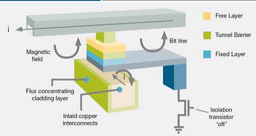 The MTJ at the cross-point of two metal lines is polarized (written) when the magnetic fields from currents flowing through two metal lines become sufficient to switch the MTJ. This is accomplished at SRAM speed.