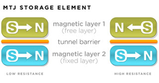 One benefit of the MTJ storage element is magnetic polarization does not leak away like an electric charge. Data can be retained for long periods of time at extended temperatures. The second benefit is that switching the magnetic polarization between the two states does not involve actual movement of electrons or atoms, thus no known wear-out mechanism exists.
