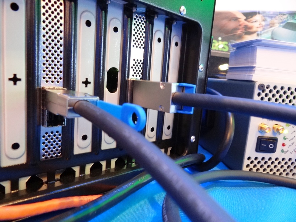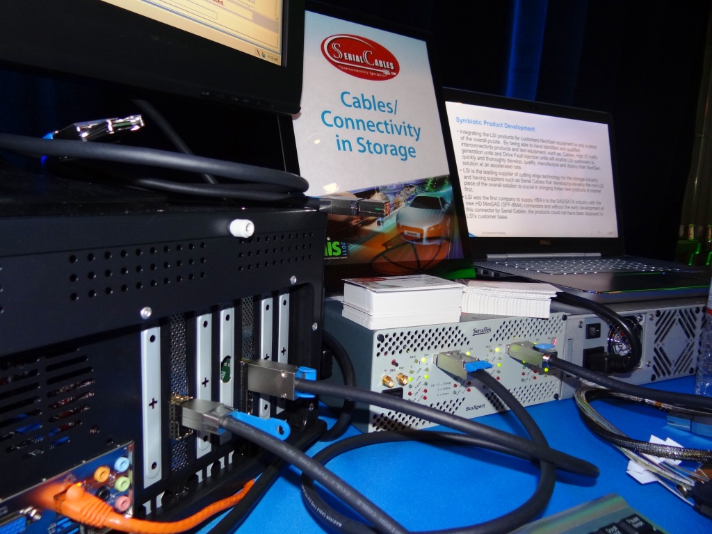 The demonstration also utilizes a new generation of SAS cabling that will utilize two links per SAS connector. This will not only increase the bandwidth per port, but also allow a transition to an easier, more manageable form factor for use in high density applications. The next step will be a release soon of a quad cable, that will further ease cabling complexity.