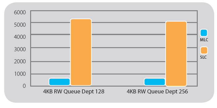 Note that CacheCade and FastPath performance depends on SSD performance. SSD performance depends on make, model, firmware, technology, specifications, and number of SSDs used. It is important to select the right SSD to achieve customers performance requirements. The chart below displays IOMeter benchmark results on an MLC and an SLC SSD. The single drives were configured as RAID 0 arrays. 4KB random writes were performed on the SSDs over two hours.