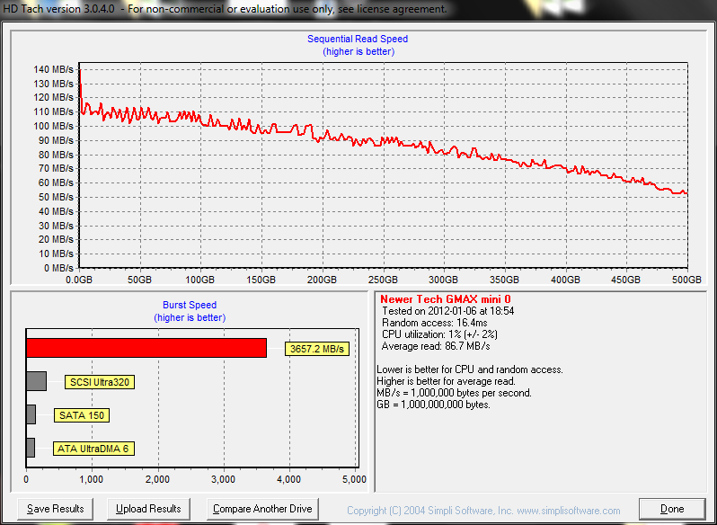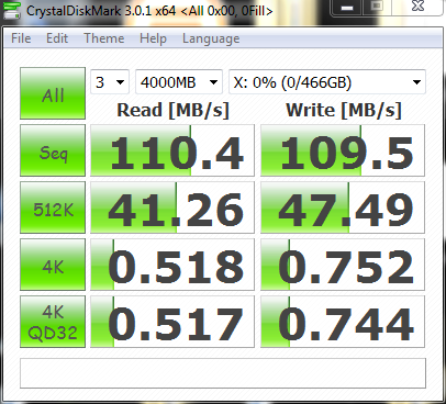 The Crystal Disk Mark results show the speed of the device with several different loadings. Again these results are within expected guidelines.