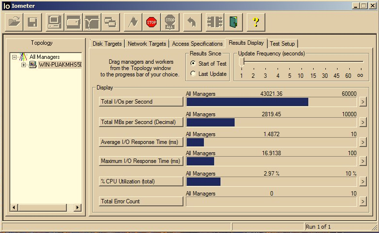 As seen in this result with Iometer testing the maximum speed (128KB @ QD 128), we did attain the highest speed of any drives that we have tested on the 9265, a whopping 2.8 GB/s! This is the limitation of the RAID card, and not the drives.