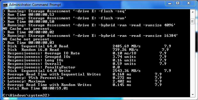 The great thing about WEI is that it sees the storage solution as the operating system sees it, so there is a true measurement of what type of performance you can expect the operating system to be able to leverage from the storage solution. You can see the amazing 2.485 GB/s read and the 2.543 GB/s write speed.