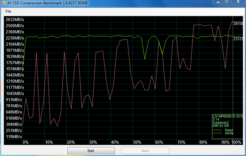 Of more consequence with this type of array, which leverages compressible data extremely effectively, is the AS SSD Compression test. As you can see here with 100 percent compressible data one can expect to reach 2.654 Gb/s write speeds and the read speeds are fairly consistent across all compressibility percentages at 2.33 Gb/s.