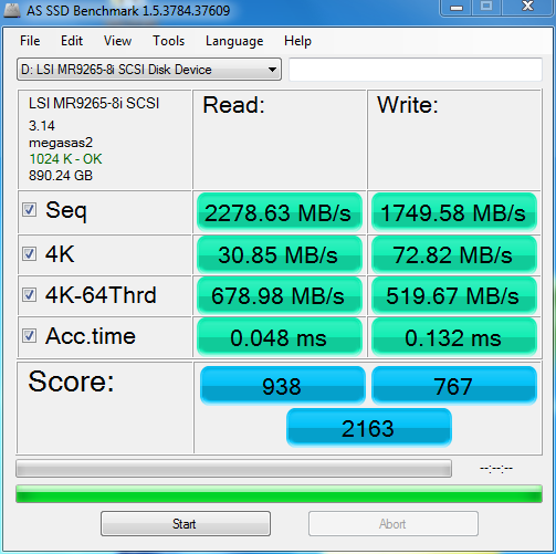 With AS SSD, there are somewhat confusing results for users as incompressible data samples are used, SandForce controlled drives usually do not have as strong of a showing here. Note the continued excellent latency that we are receiving from the device. This is truly a great result!