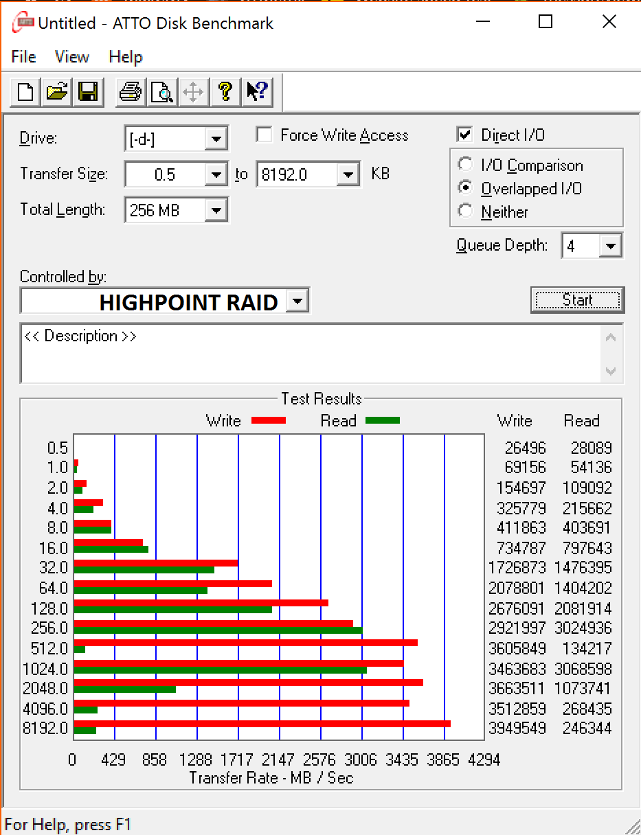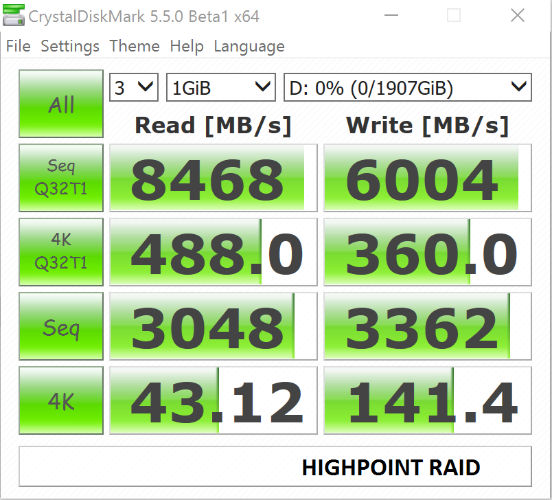 We tested the Toshiba RD400 in both the HighPoint NVMe RAID configuration, and in the OS RAID. The only RAID type in use is RAID0 and we have displayed the OS RAID results on the left with the HighPoint RAID results on the right, or OS above with HighPoint below, depending on the layout.