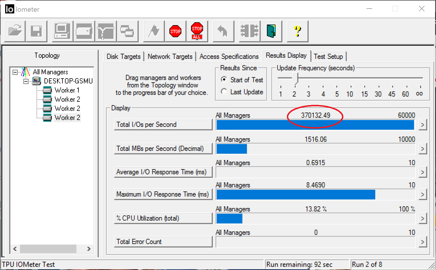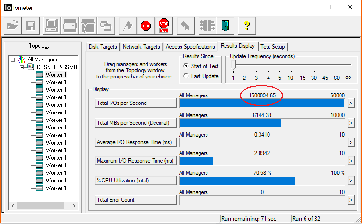 Conversely, we thought we might have better read IOPS so we ventured into Iometer once again. I used JBOD and threw four workers onto each drive separately and look at what we received: