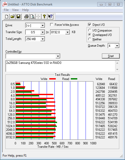 Even in RAID, the Samsung SSD performs like a workhorse. For 2xSATA II drives in RAID0, the high sequential write scores of 534MB/s read and 518MB/s (as shown in ATTO) are amazing as well as the all important 4k random scoring of 124MB/s. These 4k randoms translated into the 11 second start time as well as the PCMark Vantage test results that resulted in a very high HDD Suite score of just under 45000 points.