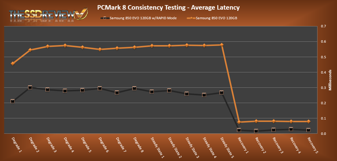 For this test we used the 120GB Samsung 850 EVO. At first, average bandwidth shows us two things. One, heavy workloads seem to result in lower average bandwidth with RAPID, and two, once the typical consumer light workloads begin, we can see it boosts performance to nearly 3x. Furthermore, we can see that the average latency without RAPID mode reaches up to almost .6ms in the Degrade and Steady State phases. Once RAPID is enabled, latency is cut down to just under .3ms. Over the Recovery phases we can see decent performance of around 0.072ms for latency without RAPID, however, once again, with it enabled we can see an average of 0.023ms for its latency performance. Finally, the total latency, results show that while bandwidth was less in steady state performance, overall, the reduction of average latency significantly speed up the workloads.