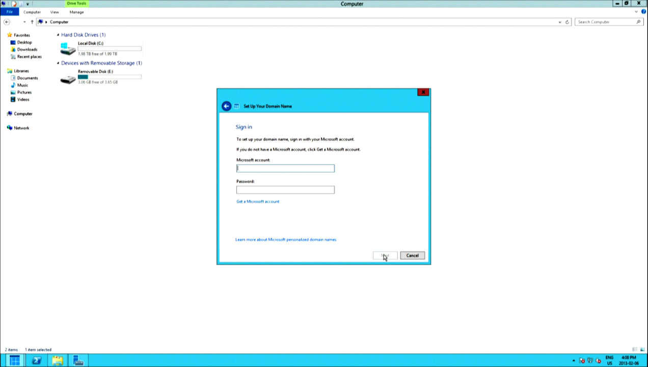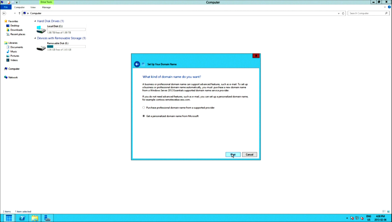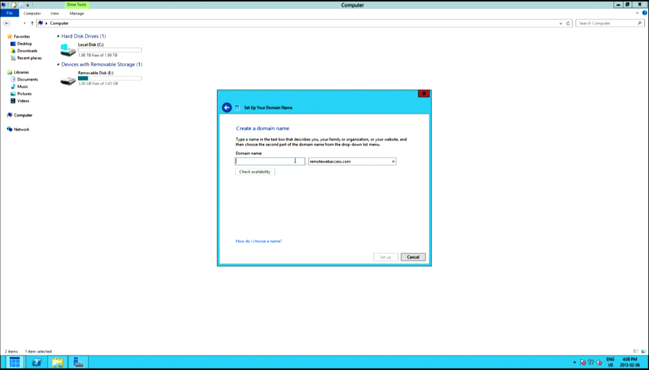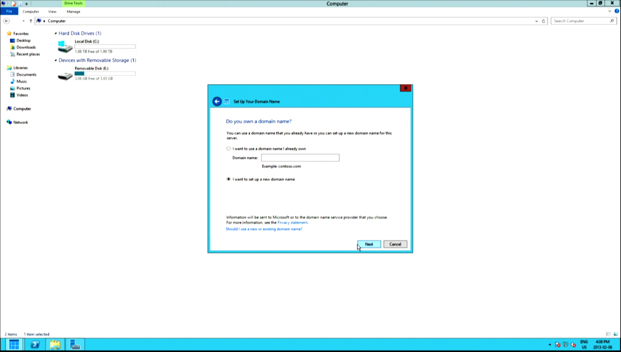 You can skip the manual router configuration if you wish, but there’s no harm in letting the configuration wizard try automatically. The next screen will ask about domain name registration. If you own one, go ahead and add your information. The alternative is a free personalized domain name, however it will be managed by Microsoft: